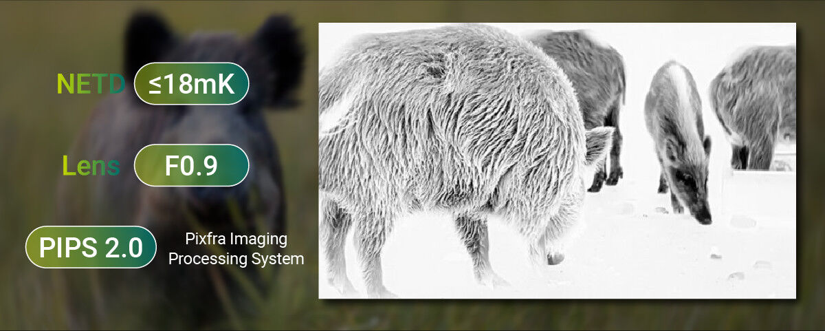 Das PIXFRA Sirius LRF S650 ist ein Wärmebildgerät der Spitzenklasse für anspruchsvolle Jäger, Outdoor-Profis und Beobachter, die maximale Reichweite, höchste Bildqualität und präzise Entfernungsmessung benötigen. Der extrem empfindliche VOx 640×512 Sensor (12 µm, <18 mK NETD) kombiniert mit dem hochwertigen 50-mm f1.0 Objektiv und dem großen 1920×1080 OLED-Display liefert ein gestochen scharfes, kontrastreiches und detailreiches Wärmebild – selbst bei extremen Wetterbedingungen oder minimalen Temperaturunterschieden. Der nahezu unsichtbar integrierte Laserentfernungsmesser misst zuverlässig bis 1000 m – ideal für die Feldjagd, den weiten Ansitz und sichere Zielansprache. Mit einer Entdeckungsdistanz von bis zu 2600 m und einem präzisen Sehfeld von 15,4 m auf 100 m bietet das Sirius LRF S650 herausragende Beobachtungsleistung auf mittleren und weiten Distanzen. Dank PIPS 2.0 Firmware, KI-gestützter AAIC-Kalibrierung, 6 Farbpaletten, Hotspot-Verfolgung, elektronischem Kompass und großem 64-GB-Speicher ist das Gerät für jede jagdliche Situation optimal gerüstet. Das robuste IP67-Magnesiumgehäuse, ein praktischer Wechselakku mit bis zu 6 h Laufzeit sowie WLAN-Livestream machen das S650 zum zuverlässigen Begleiter bei jedem Wetter.
