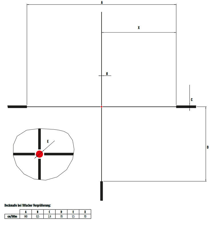 - 4A-iD-Absehen: Ideal für klassische Jagdanwendungen. Die präzise Skalierung ermöglicht eine schnelle Entfernungsschätzung (z. B. für einen Rehbock auf 100 m). Die diffraktive Beleuchtungstechnologie sorgt für eine klare Sichtbarkeit des Leuchtpunkts, selbst bei hellem Tageslicht